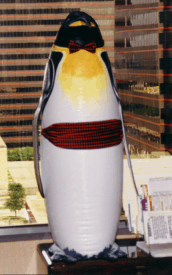 About the PenguinIf you're wondering about the penguin at the bottom of every page (and you must have, because you clicked on it), here's the deal. Penguins are kinda cool (although they are messy). The Linux penguin is kinda cute. And, don't forget about Opus, the penguin from Bloom County. I'm not obsessed with penguins, but, a long time ago, at a company where I used to work, we "adopted" a life-size inflatible emperor penguin named "Tip" (The Inflatible Penguin) . Tip became a mascot for a project that we were working on, and I became the "keeper" of Tip. The president of the company donated the bow tie and cumberbund, seen in the picture of my office at the time, below..